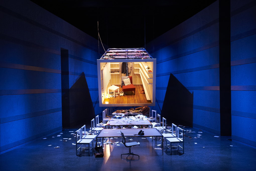 “Designer Fiona Bruce has designed a box like eyrie for Theresa above the main stage, representing her tiny Manhattan apartment; it reeks of isolation and social deprivation a big city…Bruce’s box like contraption that, like Theresa’s world, suffers spectacular collapse”. The Australian. 21 Sept 2012