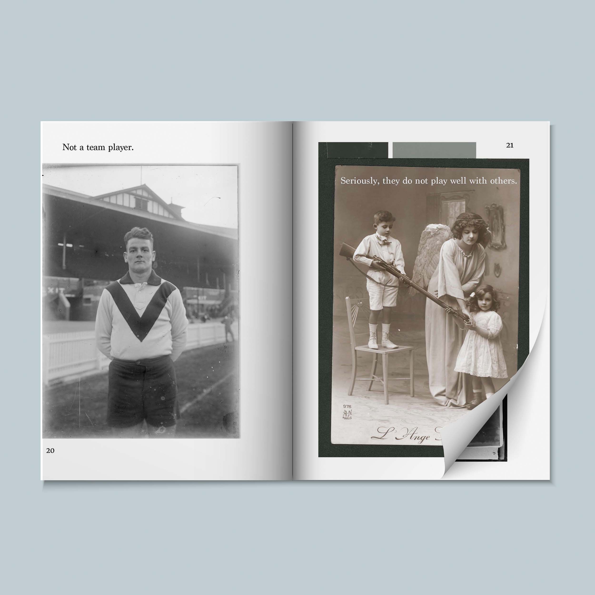 This project is an exercise in publication design, editing and meaning-making. Archive material from the State Library of Victoria was used to create a collection of images with visual and conceptual links. This publication is titled ‘Lone Wolf’ and was invited to exhibit at the Melbourne Art Book Fair at the National Gallery of Victoria.