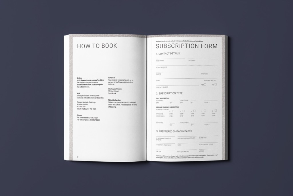 Annual season brochures are central to theatre marketing strategy and are used to attract subscribers, donors and develop audiences. These publications work on three levels by promoting the overarching corporate visual identity (the brand), an annual sub-identity to unite diverse programming (the season), and create representative, individual identities for each production (the artistic offerings). Like other arts organisations, it’s important for theatre companies to produce adaptable, content driven collateral.